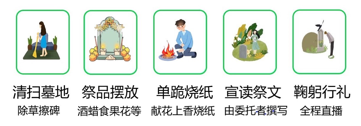 其服务包括:擦拭墓碑、诵读祭文、敬献供品鲜花、点烛上香、鞠躬行礼等一系列专业细致的仪式流程,并提供现场直播或者录像回看。